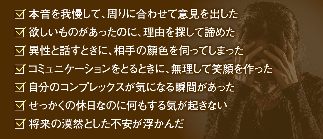 【本当の自分を出せずに、良い顔ばかりしてしまう…】【どれだけ寝ても、疲れが取れず、体がダルい…】【目標がなく、毎日が時間だけが過ぎていく】